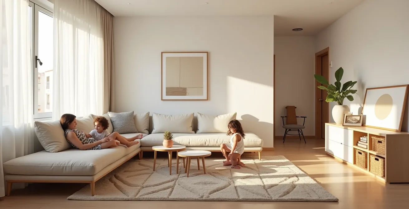 Un salón a prueba de niños no solo depende de los objetos que contiene, sino de cómo estos se organizan en el espacio. Desde la perspectiva del diseño industrial, la distribución debe optimizar el flujo de movimiento para minimizar riesgos y maximizar la usabilidad. Para ello, es útil visualizar el «triángulo de actividad familiar»: un concepto que conecta las tres zonas principales de uso: la zona de descanso (sofá), la zona de juego (suelo) y la zona social/almacenaje (mesa, estanterías).