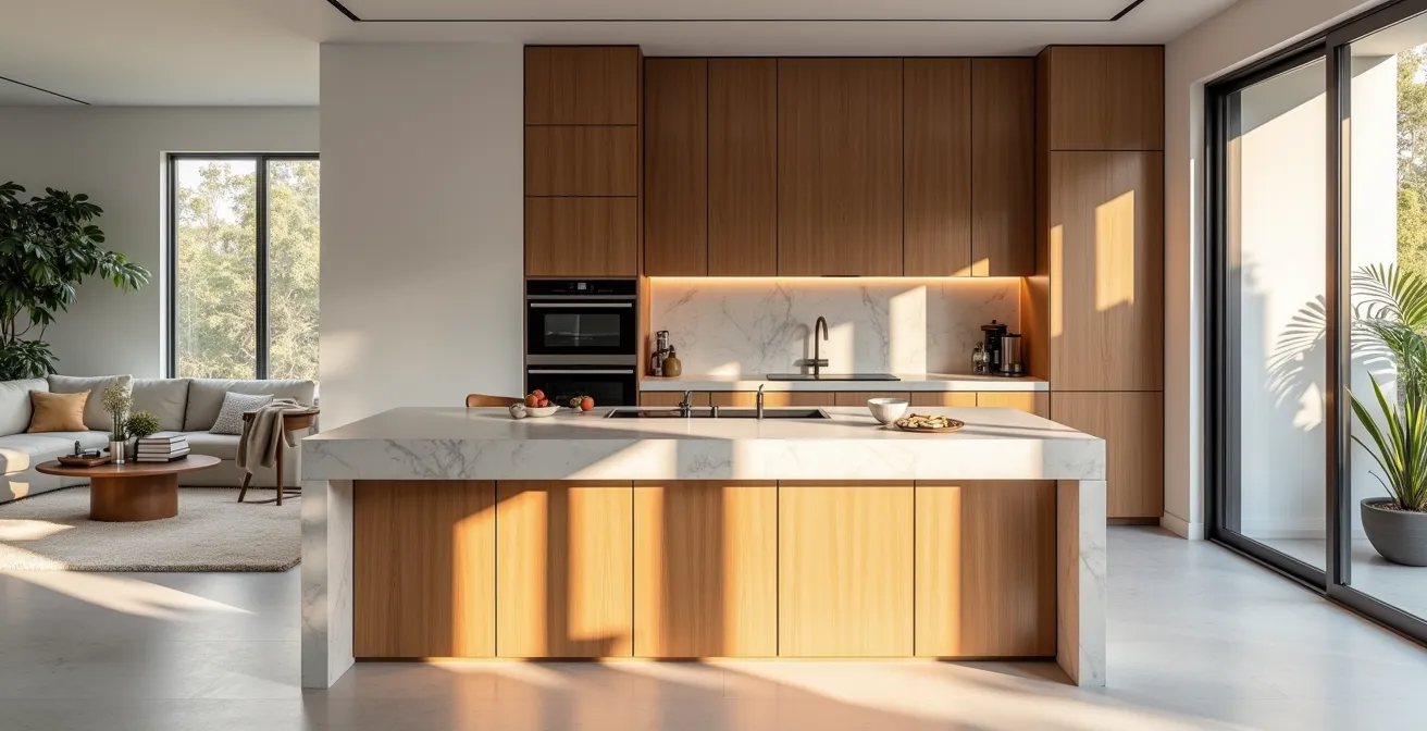 Como se aprecia en la imagen, esta dualidad funcional se refuerza con otros elementos de diseño. El almacenamiento inteligente bajo la isla es crucial para mantener el orden. Incorporar tomas de corriente escamoteables o discretas permite usar pequeños electrodomésticos o cargar dispositivos sin romper la estética. Finalmente, una iluminación colgante de diseño sobre la zona de comedor o bar no solo aporta luz focal, sino que actúa como una frontera invisible, enmarcando el área social y separándola visualmente de la zona de trabajo. Utilizar materiales resistentes y de origen local, como Silestone o Dekton, garantiza durabilidad y un acabado premium.